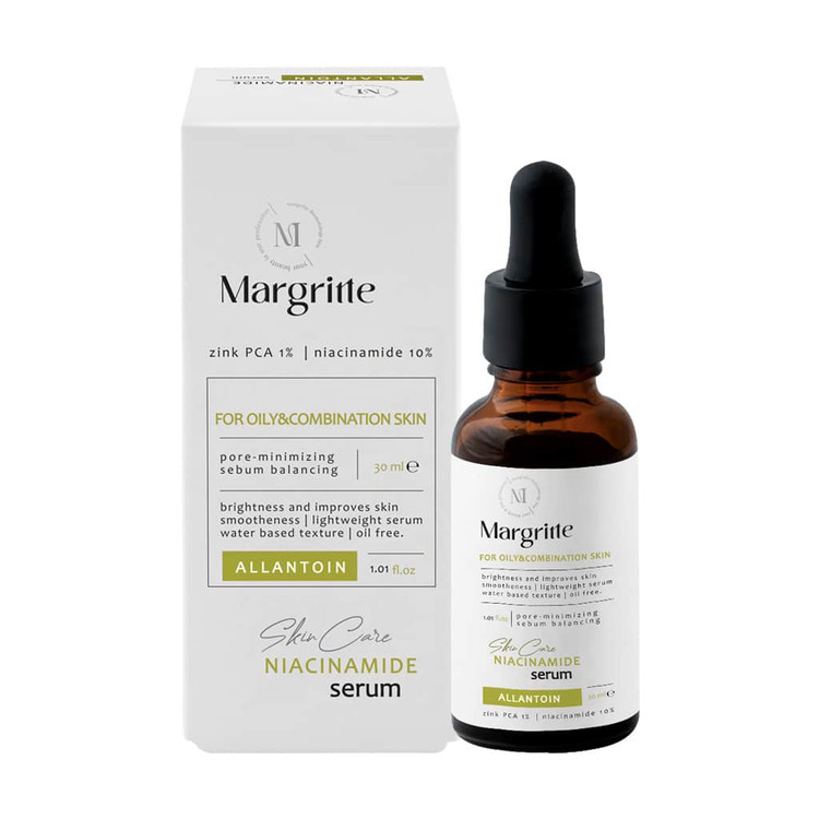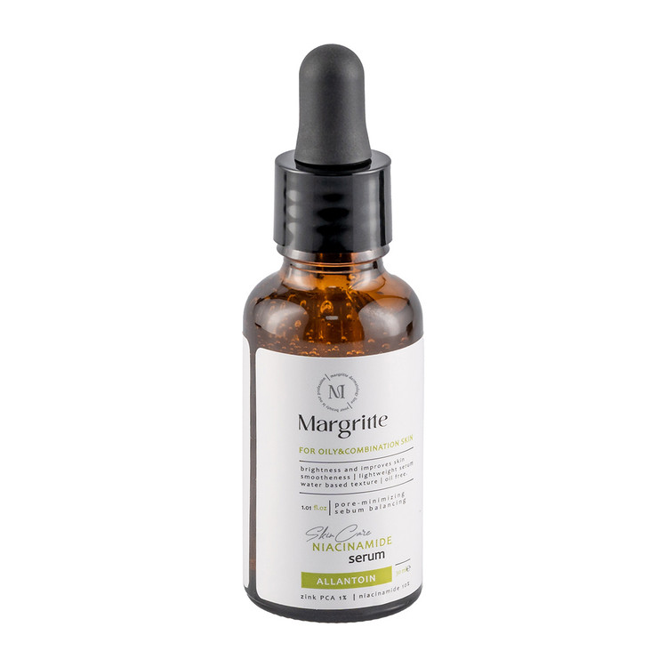 سرم نیاسینامید مارگاریت غنی شده با آلانتوئین است که قدرت بی نظیری در آبرسانی و حفظ رطوبت پوست دارد. همچنین آلانتوئین بازسازی بافت سلولی را تسریع کرده و از پوست در برابر عوامل مخرب محیطی و رادیکالهای آزاد محافظت میکند. سرم نیاسینامید مارگریت دارای ترکیبات بسیار ایمن و بدون چربی بوده که به طور تخصصی برای پوستهای چرب، مختلط و مستعد آکنه تولید شده است.